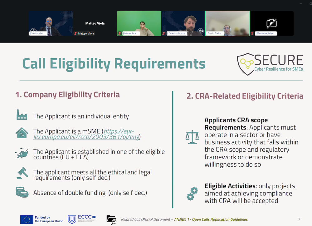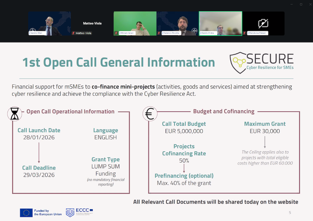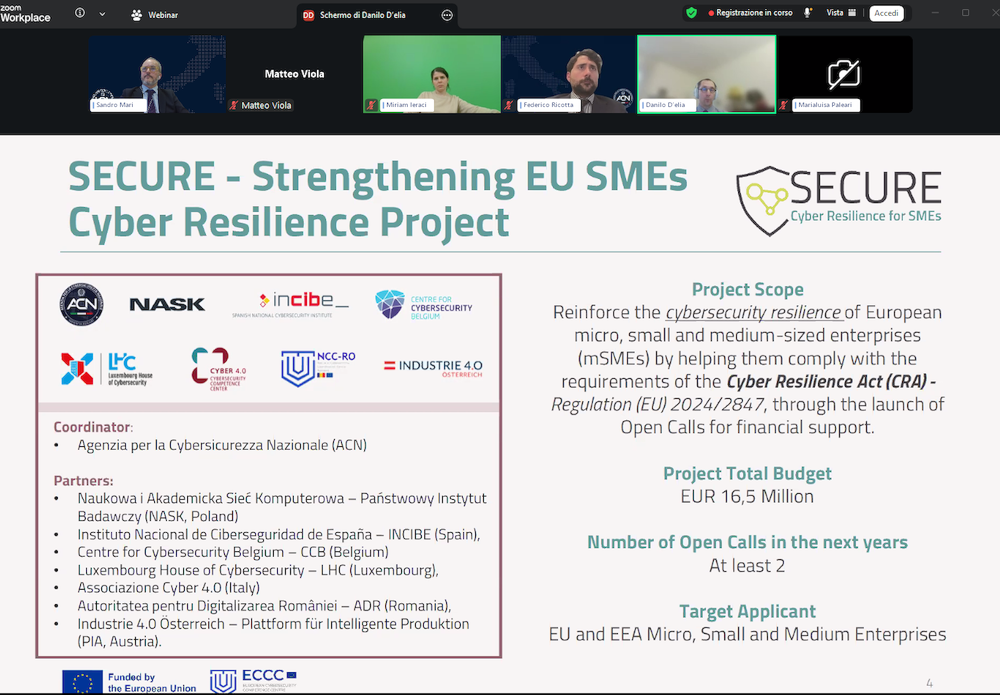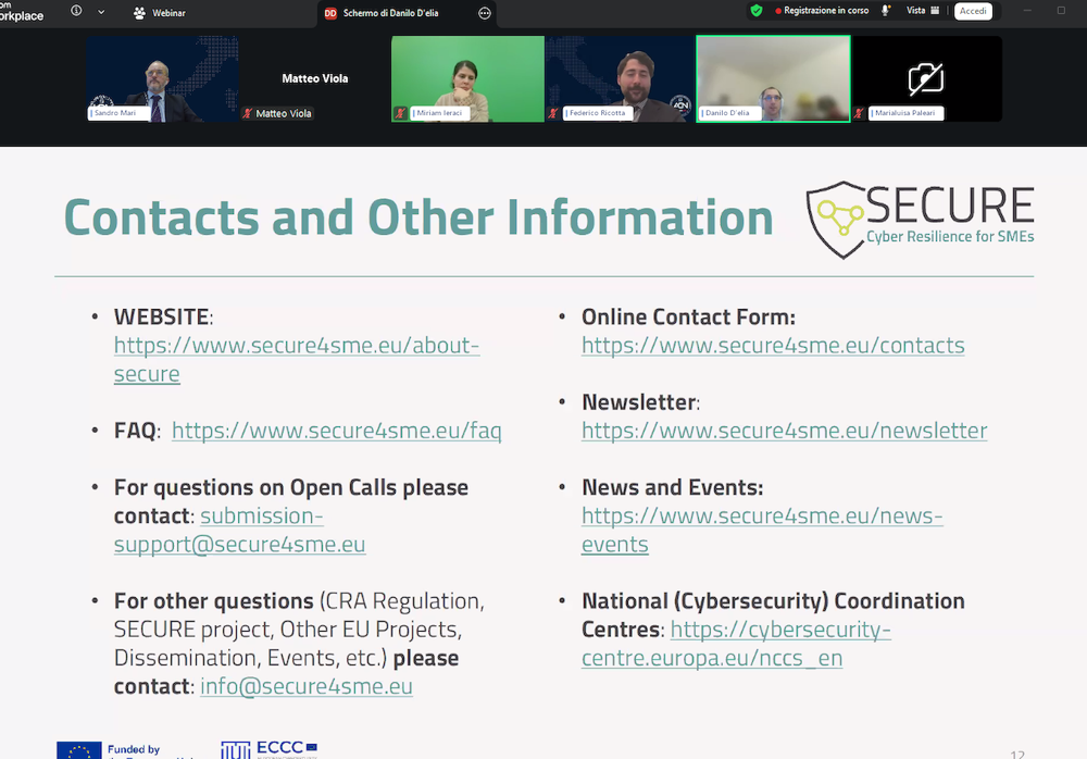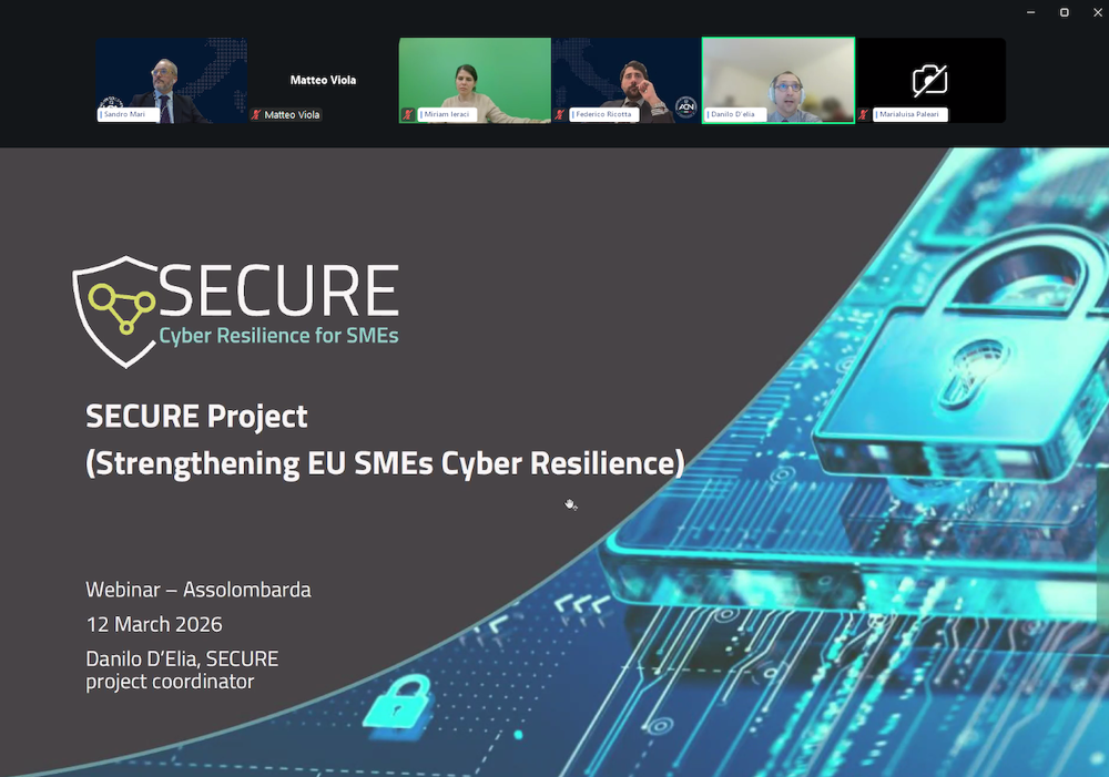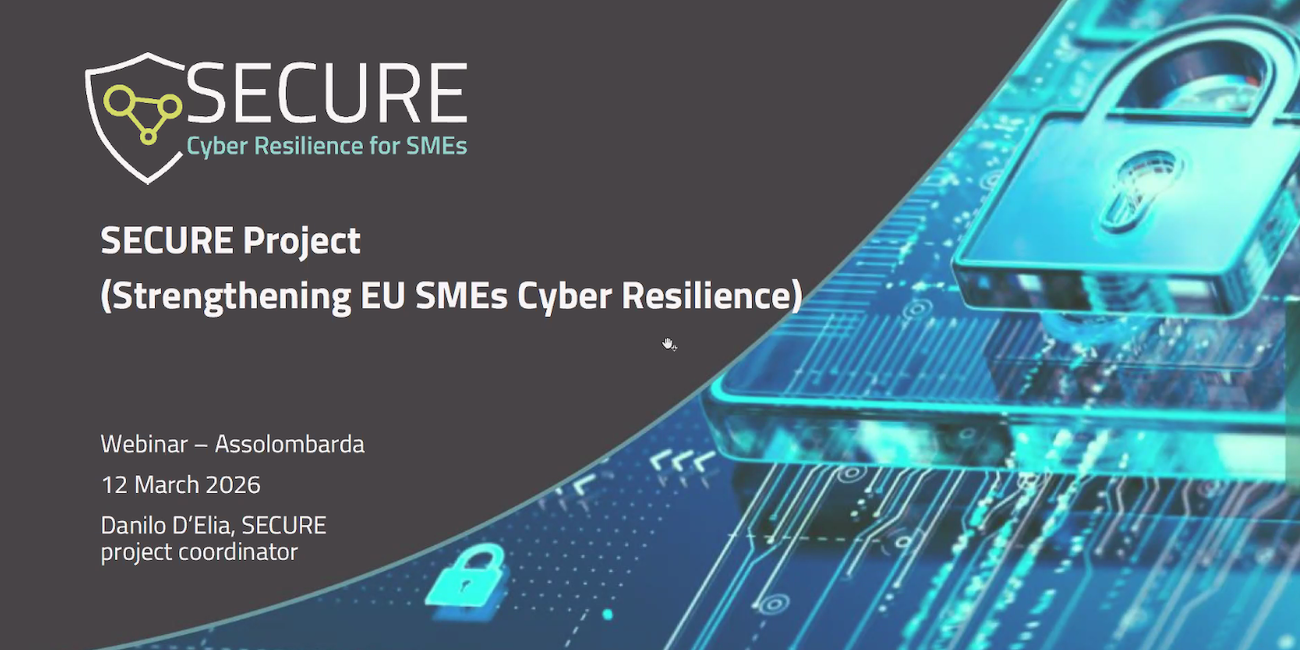 On 12 March 2026, Danilo D’Elia, SECURE Project Coordinator, participated in a webinar organized by Assolombarda—the largest regional branch of Confindustria (General Confederation of Italian Industry)— and the Agenzia per la Cybersicurezza Nazionale to present the details of the Cyber Resilience Act to its member companies.